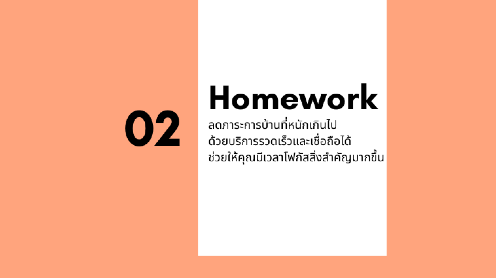 ระยะเวลาในการดำเนินการขึ้นอยู่กับความซับซ้อนของงาน โดยปกติเราสามารถส่งมอบงานได้ภายใน 24 ชั่วโมง แต่สำหรับงานที่มีความเร่งด่วนหรือขนาดใหญ่มาก เรายินดีปรับแผนการทำงานให้เหมาะสมเพื่อส่งมอบงานตรงตามกำหนดเวลาและความต้องการของลูกค้า นอกจากการทำการบ้าน เรายังให้บริการในส่วนของ การเขียนรายงาน, การทำโปรเจกต์, และ การให้คำปรึกษา สำหรับโปรเจกต์ขนาดใหญ่ที่ต้องการแนวคิดสร้างสรรค์และการวางแผนอย่างละเอียด